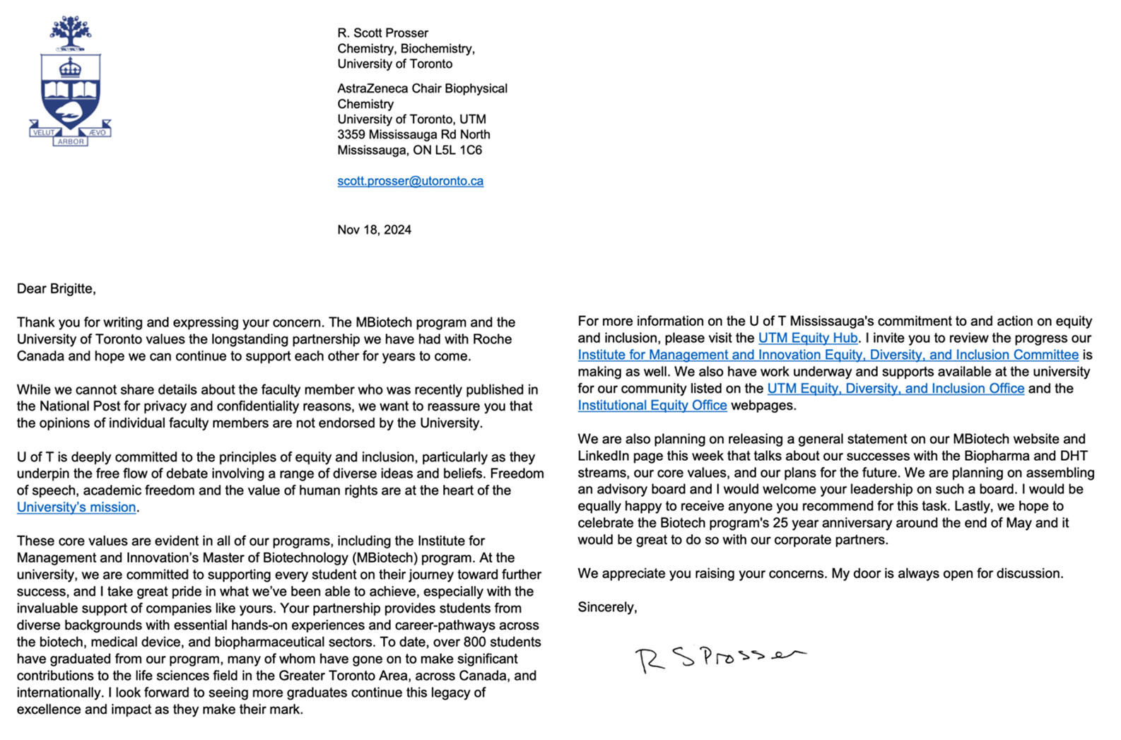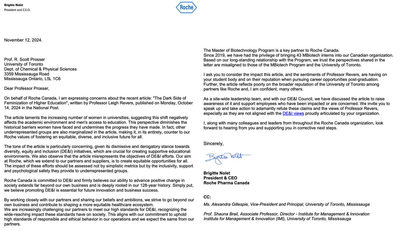 Letter from President and CEO of Roche Canada, Brigitte Nolet, to Professor Scott Prosser, dated 12 November, 2024. Released by the University of Toronto in response to Freedom of Information requests.